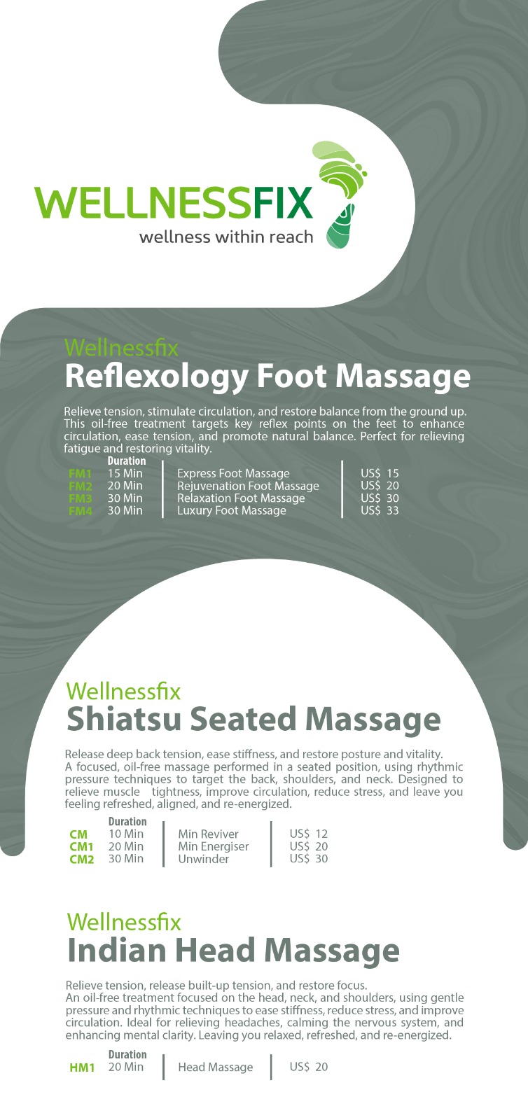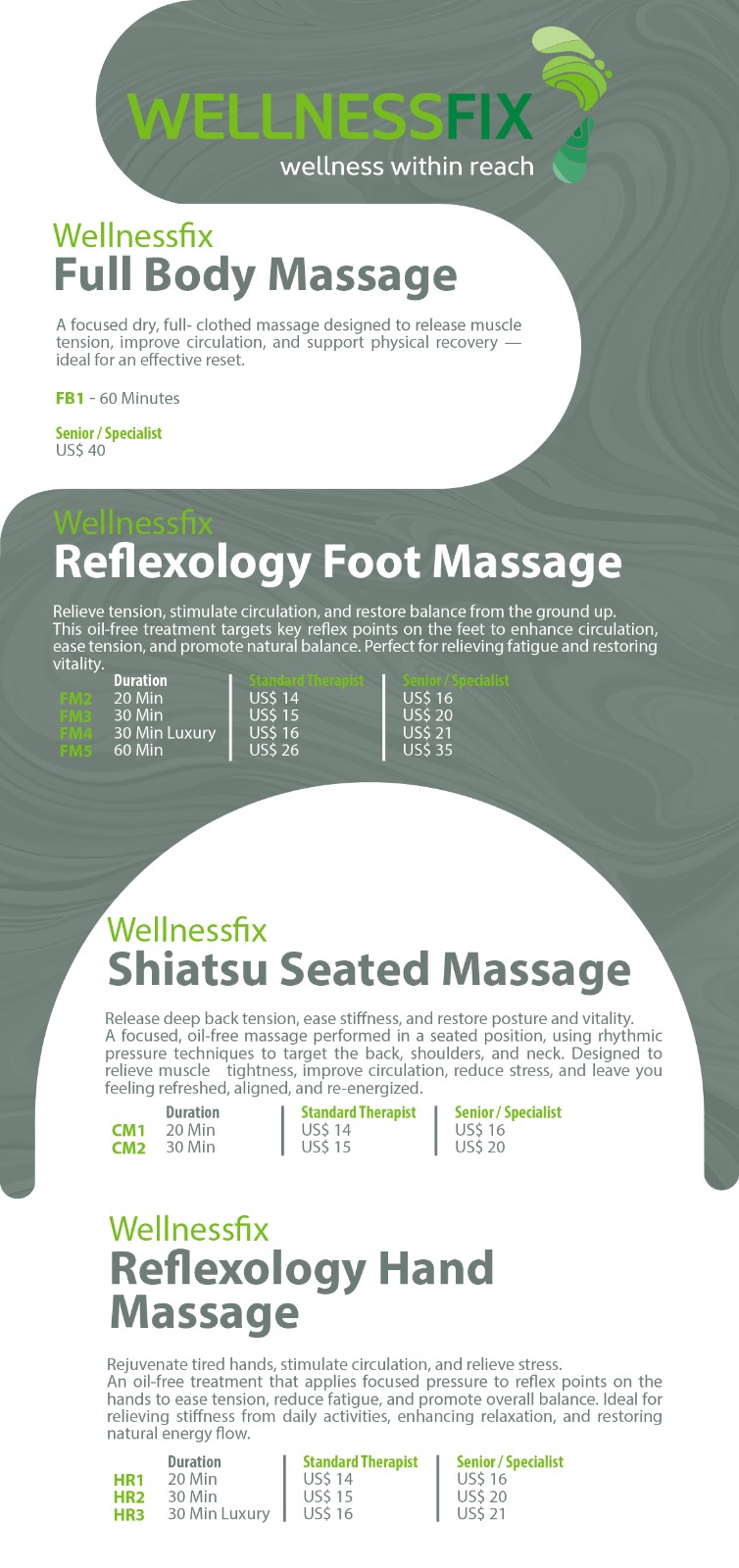 At Wellnessfix, we believe wellness should be effortless, accessible, and transformative. Rooted in the healing traditions of Reflexology and Shiatsu Acupressure, our signature treatments are designed to restore balance, recharge energy, and promote deep relaxation—without the need for oils, lengthy sessions, or the inconvenience of undressing.